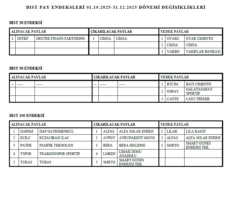 01/10/2025 ve 31/12/2025 arasında geçerli olacak BIST endeks değişikliklerini ekte yer alan tabloda görebilirsiniz.