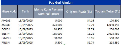 Pay geri alım programları kapsamında ilgili tarihte geri alım yapan şirketlerin listesini aşağıdaki tabloda bulabilirsiniz.