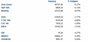 Avrupa borsalarında ise satıcılı bir seyir hakimdi. DAX %1.77 düşüşle, FTSE 100 %0.88 düşüşle CAC 40 %1.00 ve IBEX %1.51 düşüşle günü tamamladı. DAX endeksinde sağlık sektörü %1.47 artışla pozitif ayrışırken, finans %2.50 ve temel tüketim %0.95 düşüşle endeksi aşağı çeken sektörler oldu.