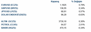 Değerli metallerde Ons Altın (COMEX) %0.28 artışla 3,729.30 dolardan, Ons Gümüş (COMEX) ise %0.17 düşüşle 42.89 dolardan günü tamamladı. Petrol piyasasında Brent petrol %1.60 artışla varil başına 68.52 dolara yükseldi. Londra Metal Borsası’nda (LME) Bakır %0.59 düşüşle 10,126.50 dolara gerilerken, Alüminyum %0.61 artışla 2,717 dolara ve Çinko %0.44 artışla 2,992 dolara yükseldi.