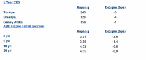 Tahvil piyasalarında, Fed’in faiz indirimi beklentileriyle birlikte alıcılı bir seyir izlendi. ABD Hazine tahvil getirileri genelinde düşüş yaşandı. 2 yıllık tahvil getirisi 2.62 baz puan azalışla %3.5126’ya, 5 yıllık tahvil getirisi 1.39 baz puan azalışla %3.5926’ya, 10 yıllık tahvil getirisi 0.48 baz puan azalışla %4.0346’ya ve 30 yıllık tahvil getirisi 0.77 baz puan azalışla %4.6530’a geriledi. Avrupa tahvil piyasalarında ise daha yatay bir seyir gözlendi. Gelişmekte olan ülke piyasalarında ise risk algısında bir miktar iyileşme vardı; Türkiye’nin 5 yıllık CDS primi 6.20 baz puan düşerek 244.78 seviyesine geriledi. Benzer şekilde, Brezilya’nın CDS primi 4.20 baz puan, Güney Afrika’nın ise 1.41 baz puan düştü.
