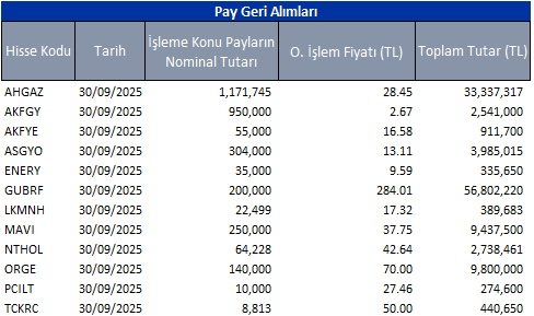Pay geri alım programları kapsamında ilgili tarihte geri alım yapan şirketlerin listesini aşağıdaki tabloda bulabilirsiniz.