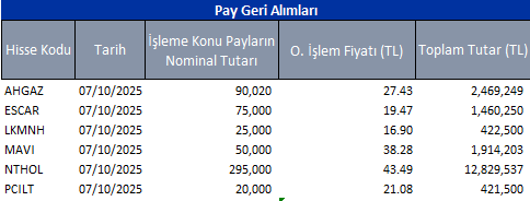 Pay geri alım programları kapsamında ilgili tarihte geri alım yapan şirketlerin listesini aşağıdaki tabloda bulabilirsiniz.