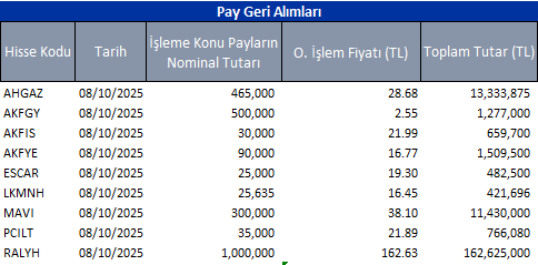 Pay geri alım programları kapsamında ilgili tarihte geri alım yapan şirketlerin listesini aşağıdaki tabloda bulabilirsiniz.