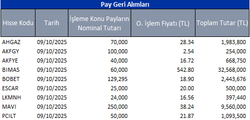 Pay geri alım programları kapsamında ilgili tarihte geri alım yapan şirketlerin listesini aşağıdaki tabloda bulabilirsiniz.