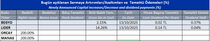 Sermaye Artırımları/Azaltımları ve Temettü Ödemeleri 13/10/2025