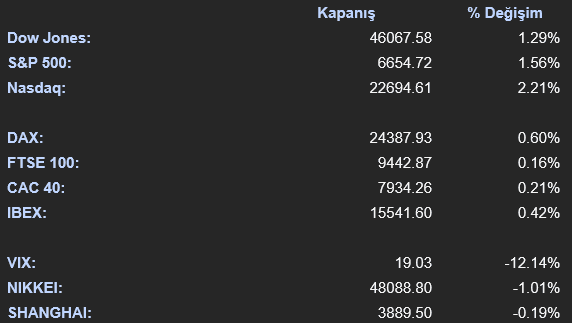 ABD endeksleri günü belirgin kazançlarla tamamladı. Dow Jones endeksi %1.29 artışla 46,067.58 puandan, S&P 500 endeksi Mayıs ayından bu yana en iyi seansını yaşayarak %1.56 artışla 6,654.72 puandan ve teknoloji odaklı Nasdaq endeksi %2.21 artışla 22,694.61 puandan kapandı. S&P 500 endeksinde en iyi performansı %2.47’lik yükselişle Bilişim Teknolojileri ve %2.29’luk artışla Takdirsel Tüketim sektörleri gösterirken, en zayıf performansı %0.09’luk düşüşle Sağlık ve %0.36’lık düşüşle Temel Tüketim sektörleri sergiledi.