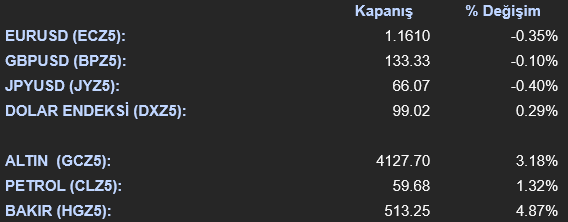 Dolar Endeksi (DXZ5), günü %0.30’luk bir artışla 99.03 seviyesinden tamamlayarak küresel para birimleri karşısında güçlendi. Bu doğrultuda EURUSD paritesi (ECZ5) %0.36’lık düşüşle 1.1609’a, GBPUSD (BPZ5) %0.10’luk düşüşle 133.33’e ve JPYUSD (JYZ5) %0.41’lik düşüşle 66.06 seviyesine geriledi. Emtia piyasasında ise risk iştahının artmasıyla güçlü alımlar gözlendi. Altın vadeli kontratları (GCZ5) %3.18 oranında sert bir yükselişle 4,127.60 dolardan kapandı. Ons Gümüş %6.87’lik dikkat çekici bir primle 50.5 dolara yükseldi. Ham petrol (CLZ5) %1.38’lik artışla varil başına 59.71 dolara, Brent petrol ise %1.31 değer kazanarak varil başına 63.55 dolardan alıcı buldu. Ekonomik aktivitenin öncü göstergesi olarak kabul edilen bakır (HGZ5) ise %4.84’lük güçlü bir artışla 513.10 seviyesine ulaştı. Endüstriyel metallerde de pozitif bir seyir vardı; LME Bakır %2.88 artışla 10,820.5 dolara, LME Alüminyum %0.55 artışla 2,763 dolara ve LME Çinko %0.65 artışla 3,021 dolara ulaştı.