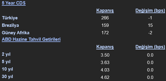 ABD tahvil piyasası Columbus Günü tatili nedeniyle kapalıydı, bu nedenle Hazine tahvil getirilerinde herhangi bir değişim gözlenmedi. Avrupa tarafında ise Almanya’nın 10 yıllık tahvil getirisi 2.64% seviyesinde yatay kalırken, İngiltere’nin 10 yıllık tahvil getirisi 2 baz puanlık düşüşle 4.66% seviyesine geriledi. Gelişmekte olan ülkelerin risk primlerinde karışık bir seyir izlendi. Türkiye’nin 5 yıllık CDS primi 1 baz puanlık düşüşle 266 seviyesine gerilerken, Güney Afrika’nınki 2 baz puan düşüşle 172 oldu. Brezilya’nın CDS’i ise 15 baz peaknik artışla 159 seviyesine yükseldi. ABD Hazine piyasasının tatil nedeniyle kapalı olması sebebiyle 2 yıllık tahvil getirisi 3.50%, 5 yıllık getiri 3.63%, 10 yıllık getiri 4.03% ve 30 yıllık getiri 4.62% seviyelerinde değişiklik göstermedi.