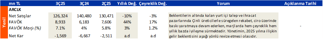 ARCLK.IS: 3Ç25 Kar Tahmini