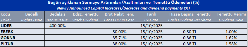 Sermaye Artırımları/Azaltımları ve Temettü Ödemeleri 15/10/2025
