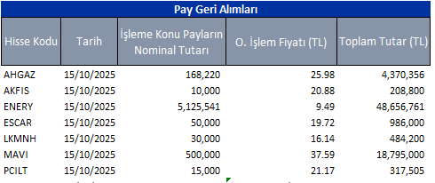 Pay geri alım programları kapsamında ilgili tarihte geri alım yapan şirketlerin listesini aşağıdaki tabloda bulabilirsiniz.