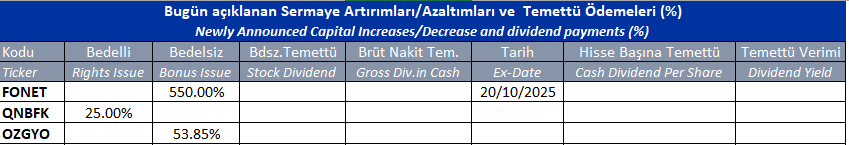 Sermaye Artırımları/Azaltımları ve Temettü Ödemeleri 16/10/2025