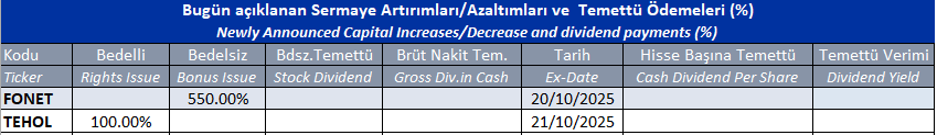 Gün içinde çıkmış veya bu sabah seans açılmadan önce açıklanmış sermaye artırımları ve temettü ödemeleri aşağıdaki tabloda görüntülenmektedir.