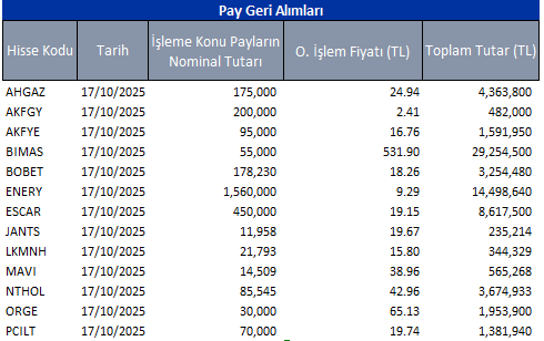 Pay geri alım programları kapsamında ilgili tarihte geri alım yapan şirketlerin listesini aşağıdaki tabloda bulabilirsiniz.