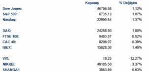Avrupa borsaları da günü pozitif bir seyirle tamamladı. Alman DAX endeksi %1.80’lik güçlü bir artışla günü tamamladı. Londra’da FTSE 100 %0.52 artışla kapanırken, Paris’te CAC 40 %0.39 değer kazanarak yükseldi. İspanya’da IBEX endeksi ise %1.46’lık primle işlem gördü. Risk iştahındaki artışa paralel olarak volatiliteyi ölçen VIX endeksi %12.27’lik sert bir düşüşle 18.23 seviyesine geriledi.