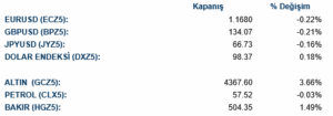 Döviz piyasalarında Dolar Endeksi (DXZ5), %0.20 artışla 98.39 seviyesine yükselerek güçlü bir duruş sergiledi. Bu yükselişin etkisiyle EURUSD paritesi (ECZ5), %0.24’lük bir düşüşle 1.1677 seviyesinden işlem gördü. GBPUSD (BPM5) %0.20 değer kaybederek 134.08 seviyesine gerilerken, JPYUSD (JYZ5) %0.19’luk bir düşüşle 66.70 seviyesinden kapandı. Emtia tarafında ise değerli metallerde güçlü bir alım dalgası gözlendi. Altın vadeli kontratları (GCZ5), %3.66’lık dikkat çekici bir artışla ons başına 4,367.50 dolardan günü tamamlarken, sanayi metali Bakır (HGZ5) %1.47 primle 504.25 seviyesine ulaştı. Petrol fiyatları ise yatay bir seyir izledi; WTI ham petrolü (CLX5) %0.03’lük sınırlı bir düşüşle varil başına 57.52 dolardan kapandı.