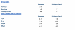 ABD Hazine tahvil getirilerinde, hisse senetlerindeki risk iştahı artışına rağmen genel olarak düşüş yönlü bir hareket gözlendi. 10 yıllık tahvil getirisi 2.50 baz puanlık bir azalışla %3.98 seviyesine geriledi. 30 yıllık tahvil getirisi 3.28 baz puan düşerek %4.57’ye, 5 yıllık tahvil getirisi ise 1.57 baz puan azalarak %3.58’e indi. Kısa tarafta ise 2 yıllık tahvil getirisi 0.20 baz puanlık sınırlı bir artışla %3.46 seviyesinde yatay kaldı. Gelişmekte olan ülke CDS primlerinde ise risk algısında bir iyileşme görüldü. Türkiye’nin 5 yıllık CDS primi 4.06 baz puan gerileyerek 269.98 seviyesine indi. Benzer şekilde, Brezilya’nın CDS primi 7.03 baz puan düşüşle 142.47’ye, Güney Afrika’nınki ise 4.81 baz puan düşüşle 165.23’e geriledi.
