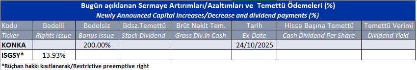 Gün içinde çıkmış veya bu sabah seans açılmadan önce açıklanmış sermaye artırımları ve temettü ödemeleri aşağıdaki tabloda görüntülenmektedir.