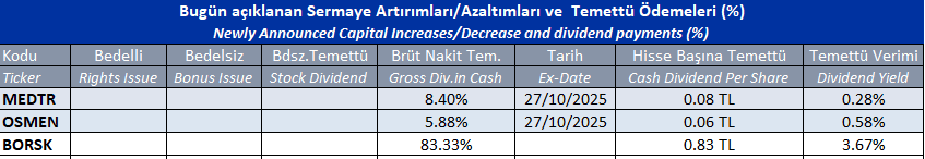 Sermaye Artırımları/Azaltımları ve Temettü Ödemeleri 27/10/2025