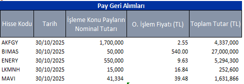 Pay geri alım programları kapsamında ilgili tarihte geri alım yapan şirketlerin listesini aşağıdaki tabloda bulabilirsiniz.