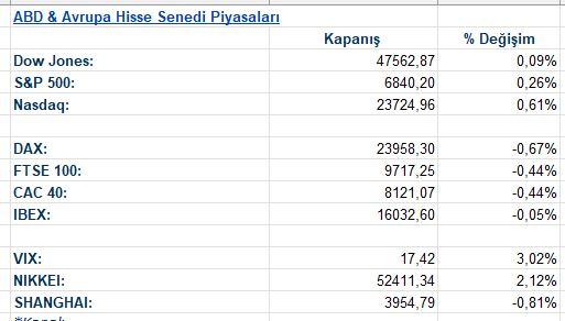 ABD endeksleri, teknoloji hisselerinin öncülüğünde günü pozitif bölgede tamamladı. S&P 500 endeksi %0.26 artışla 6,840.20 puana, teknoloji odaklı Nasdaq endeksi %0.61 primle 23,724.96 puana yükselirken, Dow Jones endeksi %0.09’luk sınırlı bir artışla 47,562.87 puandan kapandı. Özellikle “Muhteşem Yedili” olarak adlandırılan mega teknoloji şirketlerini içeren endeksin %1.2 değer kazanması, piyasanın yönünü belirledi. Asya seansında ise Japon Nikkei endeksi %2.12’lik güçlü bir yükseliş sergilerken, Çin’in Shanghai endeksi %0.81 oranında değer kaybetti. Korku endeksi olarak bilinen VIX ise %2.96 artışla 17.41 seviyesine yükseldi.