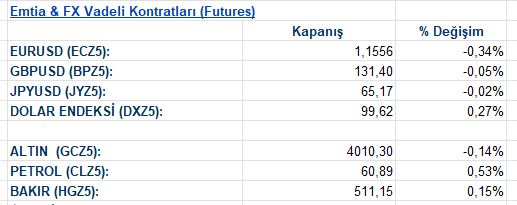 Emtia piyasasında, güçlü doların etkisiyle Ons Altın (GCZ5) vadeli kontratları %0.12 düşüşle 4,010.90 dolardan kapandı. Petrol fiyatları ise pozitif ayrıştı; WTI ham petrolü (CLZ5) %0.53 artışla varil başına 60.89 dolara yükseldi. Sanayi metali bakırın (HGZ5) vadeli kontratı ise %0.13’lük sınırlı bir artışla 511.05 seviyesinden günü tamamladı. Veri setinde LME metalleri (alüminyum, çinko) ve gümüş için anlamlı bir fiyatlama yer almamıştır.