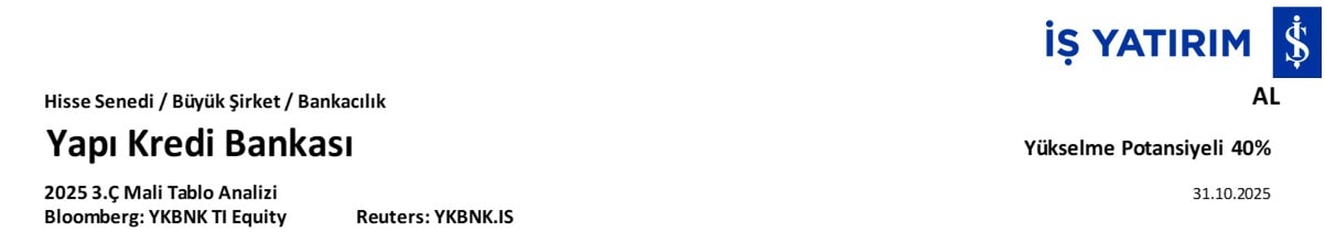 YKB, 2025 yılının üçüncü çeyreğinde TL15,1milyar solo net kar açıkladı. Açıklanan net kar rakamı bizim ve piyasa beklentisi olan TL 13,3 milyarın yaklaşık %15 üzerinde bulunuyor. Bankanın çeyreklik net karı %33 artarken, yıllık kar ise kümülatif olarak ilk dokuz ayda geçen senenin aynı dönemine göre %69 artış gösterdi. Yapı Kredi’nin 2025 üçüncü çeyrek yıllıklandırılmış öz kaynak karlılığı ise %26 seviyesinde gerçekleşti. Bu rakam bir önceki çeyrekte %21 düzeyinde bulunuyordu. Açıklanan kar ile tahminlerimizdeki farkın en önemli nedenleri beklentilerin üzerinde gelen ücret ve komisyon gelirleri ile yine beklentilere göre düşük gelen vergi gideri oldu. Bankanın swapa göre düzeltilmiş marjı çeyrekte 55baz puan yükselirken, yine swap sonrası net faiz geliri bu çeyrek %44 artış kaydetti. Kredi spredleri genel zayıf seyrini korurken, swapların sağladığı maliyet avantajı ve menkul kıymet faizlerinin güçlü seyri marjın artmasının itici kuvvetleri oldu. Ücret ve komisyon gelirleri güçlü seyrini koruyarak çeyrekte %13 arttı. Bankanın özellikle aktif kalite konusundaki olumlu görünümü devam ediyor net takibe atılan krediler yatay kalırken, net risk maliyeti çeyrekte sadece 7 baz puan artarak 177 baz puan oldu. Banka, 2025 ylı için verilen orta haneli yüzde yirmili özkaynak hedefini koruyor. Burada marjın 200-225 baz puan yıllık artacağı öngörülmüştü. Bizim YKB için 2025 özkaynak karlılık tahminimiz ise %25 ve bankanın hedefleriyle uyumlu gözüküyor.