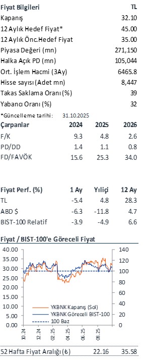 Üçüncü çeyrek sonuçları 2025 hedeflerini teyit ediyor. Üçüncü çeyrekte açıklanan beklentilerin üzerindeki net kar rakamı bankanın yıl sonu hedefi olan orta haneli yüzde yirmili özkaynak hedefine ulaşacağını gösteriyor. YKB, benzer bankalar göre yılın başındaki hedeflerini daha ılımlı biçimde yıl ortasında revize etmişti. YKB için 2025 yılında %25.3’lük özkaynak karlılık tahminimiz bulunuyor. Banka için AL tasviyemizi koruyoruz.