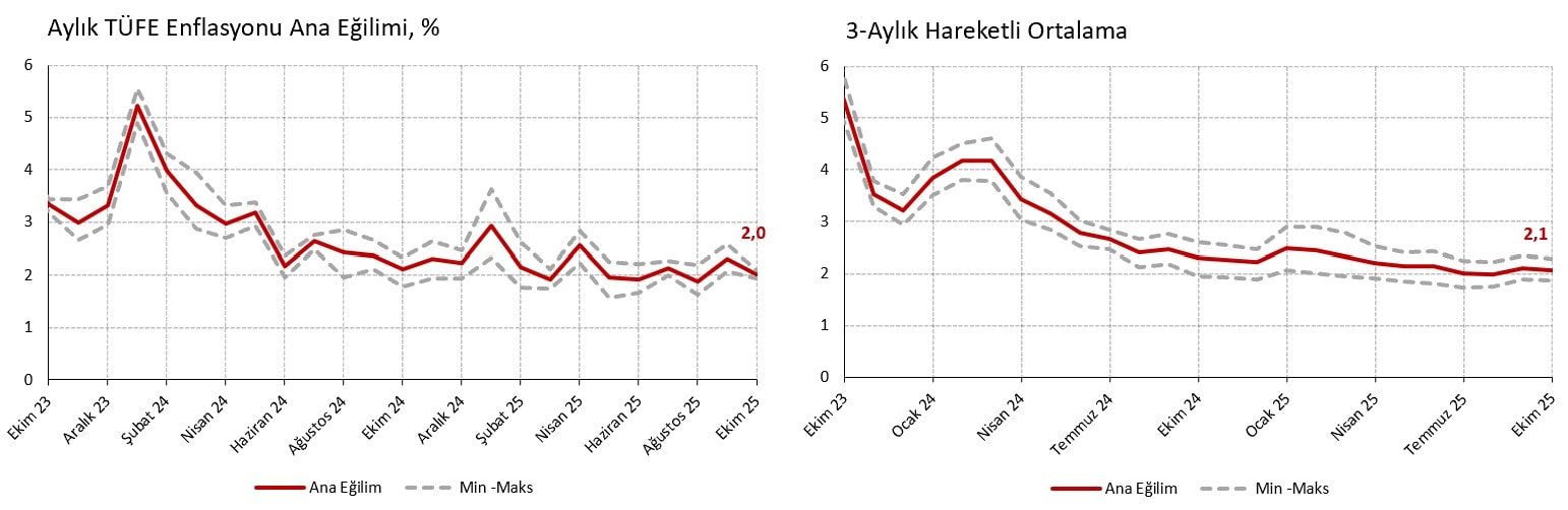Uç değerler veya geçici şoklardan etkilenen kalemleri kalıcı veya dinamik şekilde dışlayan mevsimsellikten arınmış 4 eğilim göstergesinin ortalamasını (çekirdek B, çekirdek C, medyan, budanmış) alarak TCMB’nin hesapladığı ana eğilimi taklit ediyoruz. Ekim ayı için, söz konusu tahmini ana eğilim aylık %2,0 (Eylül %2,3, Ağustos %1,9, Temmuz %2,1) ile önceki aya göre 0,3 puan geriliyor. Tahmini ana eğilimin 3-aylık hareketli ortalaması da %2,1 (Eylül %2,1, Ağustos %2,0, Temmuz %2,0) ile görece yatay seyrediyor.