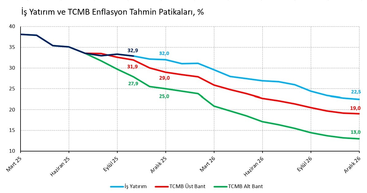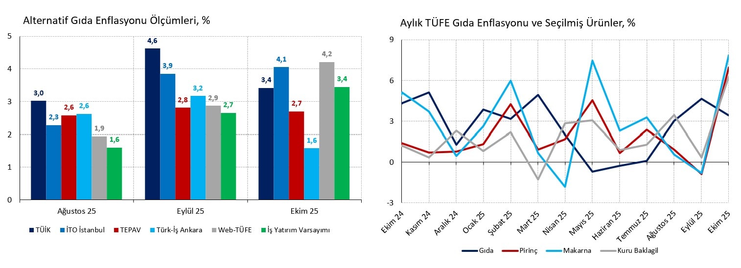 Gıda tarafında aylık enflasyon %3,4 ile İş Yatırım tahminine eşit, Web-TÜFE (%4,2), İTO (%4,1), TEPAV (%2,7) ve Türk-İş (%1,6) tahminleri ortalamasına yakın gerçekleşti. Mevsimselliği yüksek ve iklimsel şoklardan doğrudan etkilenen işlenmemiş gıda grubunda taze sebze (%13,8), yumurta (%6,5) ve taze balık (%6,2) gibi ürünlerde fiyat artışının yüksek olması şaşırtıcı değil. Ancak toz kakao (%11,4), makarna (%7,8), pirinç (%6,9) ve kuru baklagil (%6,3) gibi işlenmiş ürünlerdeki bozulma gerçekten rahatsız ediyor. Önceki aya göre 1,2 yüzde puan gerileyerek %34,9 düzeyine gerileyen yıllık gıda enflasyonu 2025 yılı TCMB tahmininin (%26,5) çok üzerinde.
