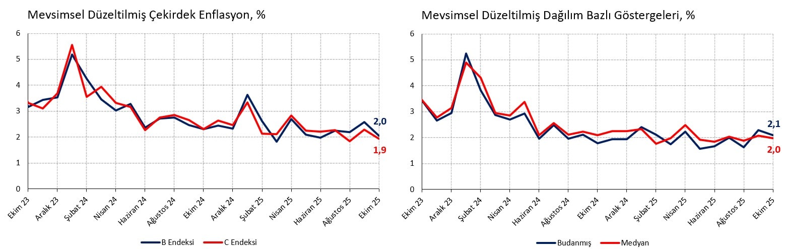 4 Kasım Salı günü saat 17.00’de ilave veriler açıklanana kadar TÜİK yöntemiyle mevsimsel düzeltilmiş aylık manşet enflasyonu %2,1 (Eylül %2,7, Ağustos %2,5, Temmuz %2,6) olarak hesaplıyoruz. TÜFE sepetindeki 143 alt kalemin medyan enflasyonu ise %1,3 gibi düşük bir seviyede. Mevsimsel düzeltilmiş medyan %2,0 (Eylül %2,1, Ağustos %1,9, Temmuz %2,0) ile sınırlı bir iyileşmeye işaret ediyor. Diğer yandan tüm eğilim göstergelerini topluca incelediğimizde %2 civarındaki katılığın henüz çözülmediği görülüyor.