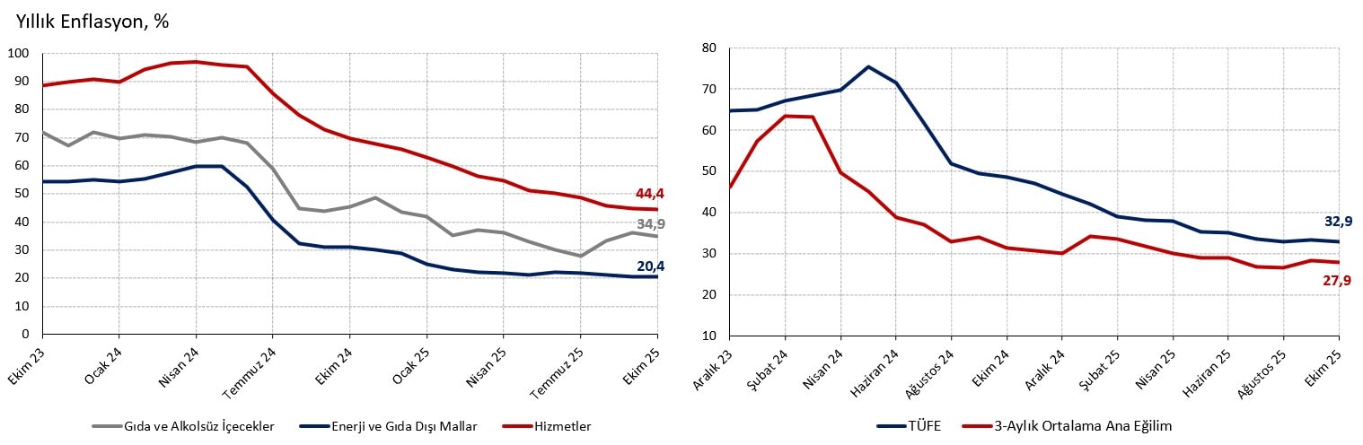 15 aylık düşüş serisinin bozulduğu Eylül ayında yıllık enflasyon 0,3 yüzde puan artarak %33,3 düzeyine yükselmiş, ileri dönük beklentilerin bozulmasına katkıda bulunmuştu. Ekim ayında ise yıllık rakam 0,4 puan gerileyerek %32,9 seviyesine yani Ağustos (%33,0) ayının da altına iniyor.