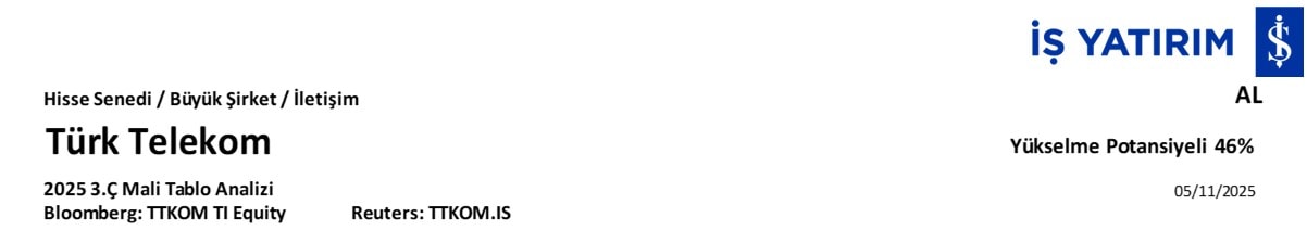 Net kârda güçlü bir beklenti üstü performans. Türk Telekom, 3Ç25’te 10,2 milyar TL net kâr açıklayarak yıllık bazda %158 artış kaydetti ve piyasa beklentisini %71 oranında aştı. Güçlü net kâr performansı; sağlam operasyonel sonuçlar, daha düşük amortisman gideri, azalan finansman giderleri ve düşük efektif vergi oranı ile desteklendi. Net finansman giderleri yıllık bazda %40 azaldı; bu da büyük ölçüde, USD/TRY ve EUR/TRY kurlarındaki ortalama %25 artışın aynı dönemdeki enflasyonun gerisinde kalmasından kaynaklandı. Düşük faiz oranları ve hedging maliyetlerindeki azalma da bu iyileşmeye katkı sağladı. Finansman giderlerindeki keskin düşüş, net kâr beklentilerindeki sapmanın temel nedeni olarak öne çıkıyor.