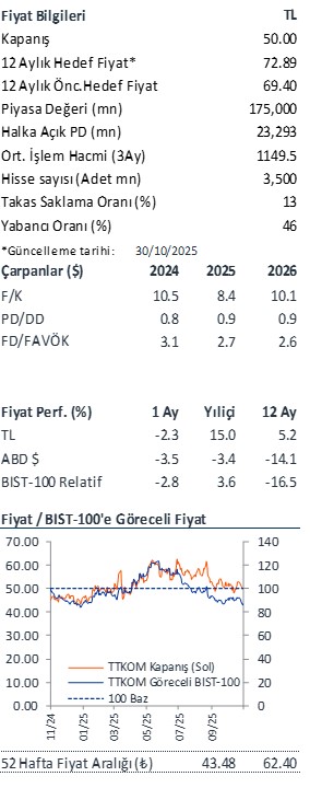 2025 yılı beklentilerinde yukarı revizyon. Güçlü 9A25 performansının ardından Türk Telekom, 2025 yılı FAVÖK marjı hedefini %41’den %41,5’e yükseltti; %10 reel gelir büyümesi ve %29 yatırım harcaması/satış oranı beklentilerini ise yıl sonu enflasyon varsayımı %29 ile değiştirmeden korudu. 9A25 operasyonel gelir artışının %12,7 seviyesinde gerçekleşmesi yukarı yönlü potansiyele işaret etse de, yönetim 4Ç enflasyon görünümü ve yüksek baz etkisi nedeniyle temkinli yaklaşımını sürdürüyor. Yatırım harcaması yoğunluğunun 4Ç25’te artması bekleniyor.
