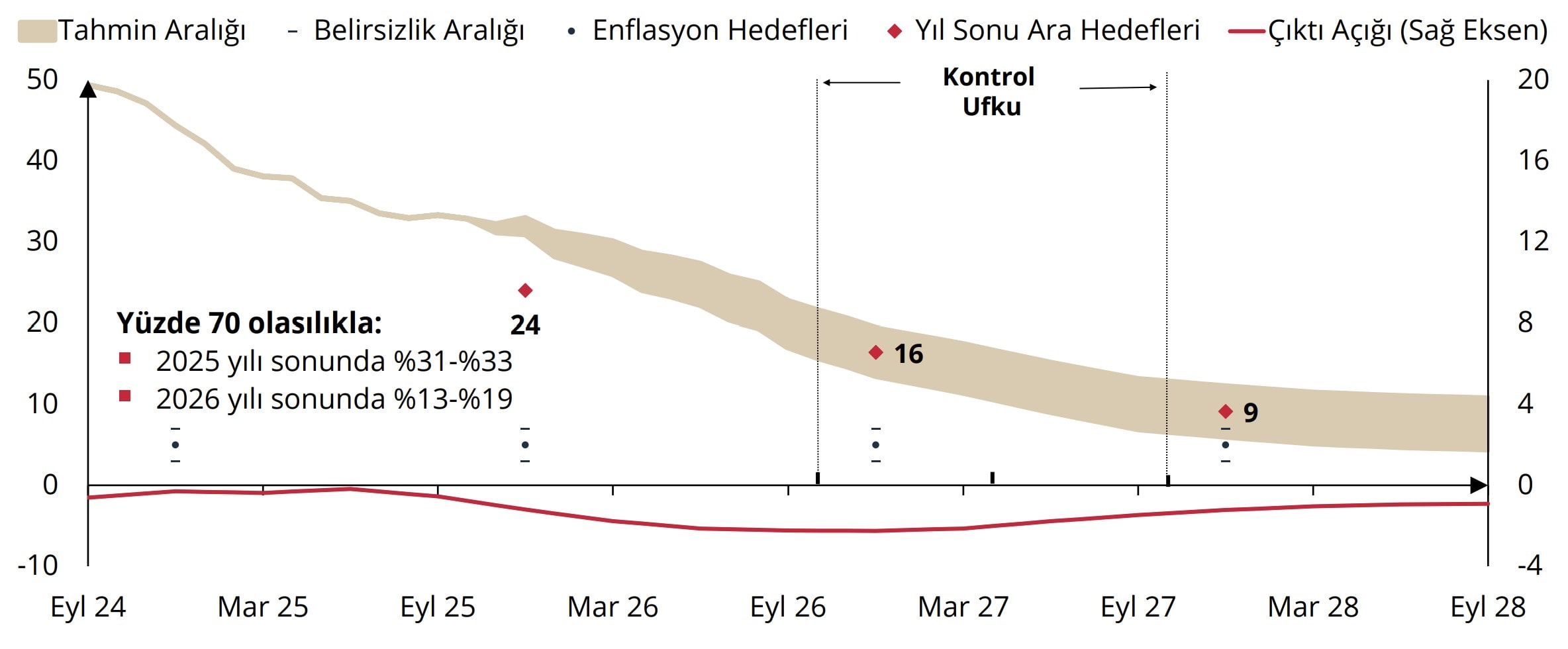 TCMB yönetimi %31-%33 bandına çektiği 2025 enflasyon tahmin aralığının %24 ara hedefinin çok üzerinde olmasına faiz indirim adımını küçülterek cevap verdiklerini vurguladı. TCMB ekonomide yavaşlamanın, iç ve dış talep koşulları vasıtasıyla dezenflasyon sürecini desteklediğine inanıyor. Maliye politikasının önümüzdeki dönemde daha destekleyici olacağını varsayıyor.