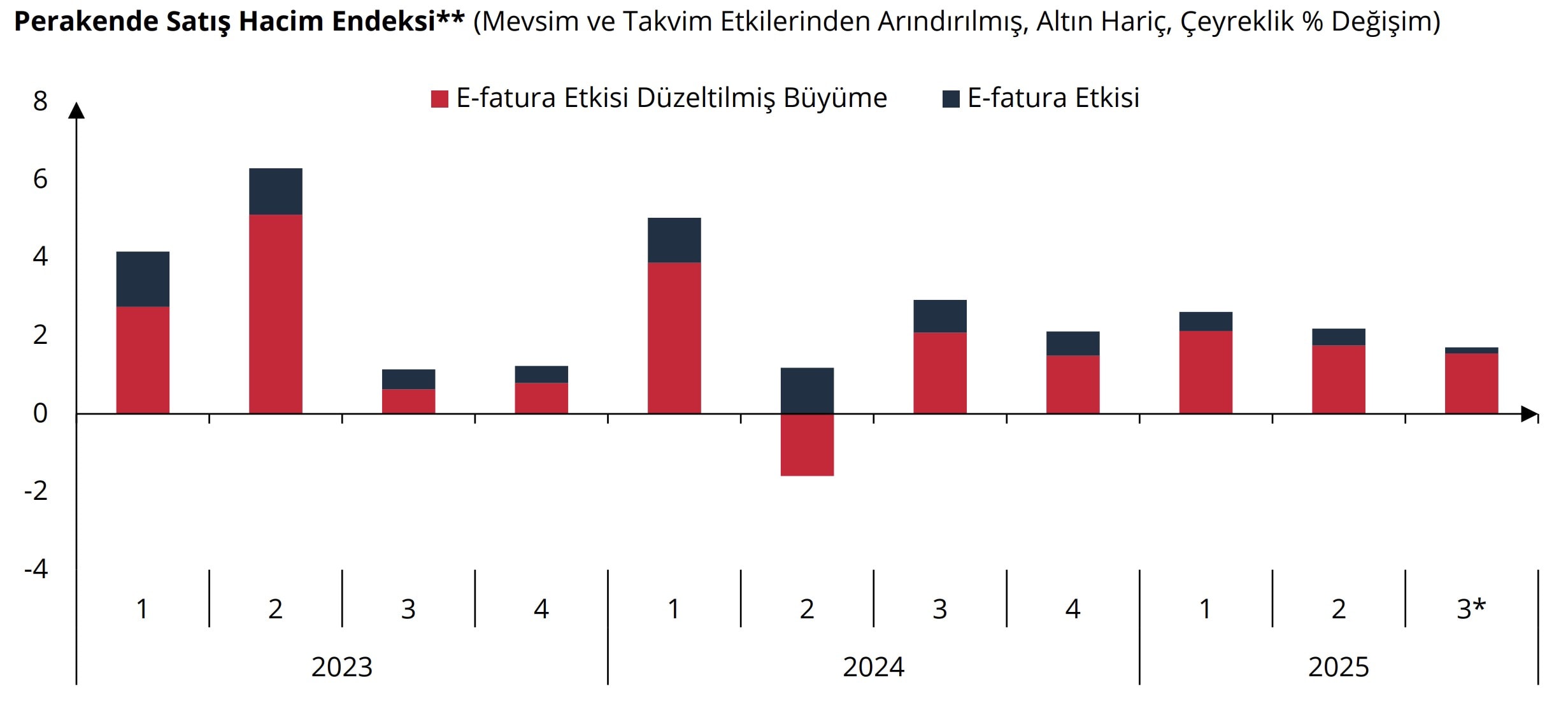 Kaynak: TCMB 2025-IV Enflasyon Raporu. *Ağustos ayı itibarıyladır. **Altın hariç perakende satış hacim endeksi, perakende ticaret faaliyetleri arasında yer alan “47.77 – Uzmanlaşmış mağazalarda saat ve mücevher perakende satışı” kaleminin dışlanmasıyla elde edilen saat ve mücevher hariç perakende satış hacim endeksini ifade etmektedir.