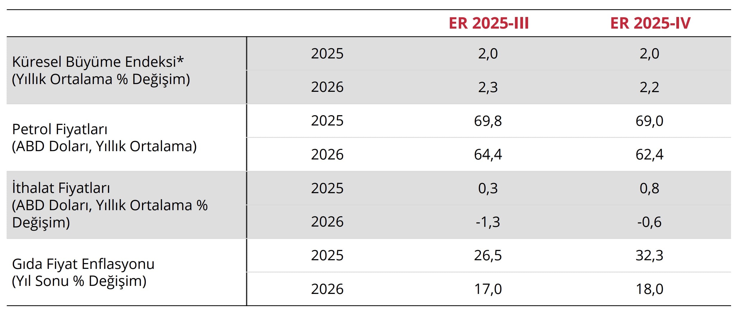 TCMB enflasyon tahminlerine dayanak oluşturan ihracat ağırlıklı küresel büyüme tahminini 2025 yılında %2,0 düzeyinde sabit tutup 2026 tahminini %2,3 seviyesinden %2,2’ye çekti. Arz ve talep koşullarının etkisiyle yıllık ortalama varil petrol fiyatı tahminini 2025 için 69,8 dolardan 69’a, 2026 için 64,4 dolardan 62,4’e düşürdü. Ortalama dolar bazında ithalat fiyatları artış tahmini 2025 için %0,3’den %0,8’e artırılırken, 2026 için %-1,3’den %-0,6’ya çekildi.