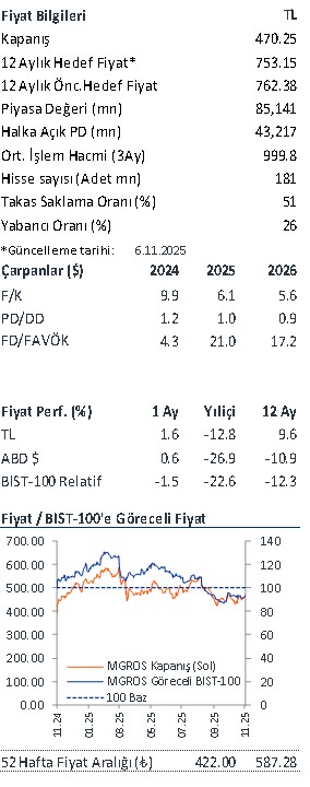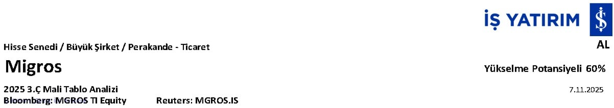 FAVÖK marjı, tahakkuk eden faiz etkisindeki düşüşe rağmen, 3Ç25’te %10,8’e çıkarak geçen yılki %10,6’nın üzerine çıktı. Bu etki arındırıldığında, FAVÖK marjı yıllık 80 baz puan artışla %6,4’e ulaştı (3Ç24: %5,6) ve operasyonel giderlerdeki iyileşme dikkat çekti. UMS-29 hariç net kâr, 3Ç25’te 3,32 milyar TL ile yatay seyretti ve %3,2 net marj kaydedildi. Migros yılın ilk dokuz ayında 187 yeni mağaza açarak toplam mağaza sayısını 3.730’a çıkardı. Satış alanı yıllık bazda %3 artışla 2.064 bin m²’ye yükseldi. Online hizmet mağaza sayısı 459 artışla 1.881’e ulaştı. Online kanal performansı güçlü seyrini korudu; brüt işlem hacmi (GMV) %21 artarak 50,3 milyar TL’ye çıktı, sipariş adedi ise %12 artışla 56,7 milyon oldu.