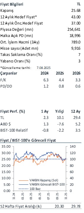 Vakıfbank görünümüne ilişkin pozitif görüşümüzü koruyoruz. Dayanıklı varlık kalitesi ve güçlü ücret-komisyon geliri trendi, yıl sonuna kadar kârlılık görünümünü desteklemeye devam edecek. Hisse başına 43 TL hedef fiyatımız, %67 yükseliş potansiyeline işaret etmektedir.