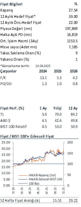 Beklentilerin üzerinde gelen net kar rakamına, özellikle dayanıklı çekirdek faiz marjı performansı ve kontrol altında tutulan gider artışı nedeniyle, hafif olumlu bir piyasa tepkisi bekliyoruz. Halkbank yönetimi 2025 beklentilerini korumaya devam etse de %4’lük net faiz marjı hedefinin yakalanmasına ilişkin risk görmeye devam ediyoruz. Yine de bankanın faiz indirim döngüsünden fayda sağlamaya uygun bir konumda olduğunu düşünüyoruz.