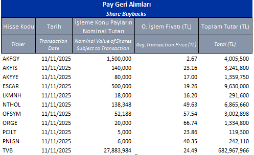 Pay geri alım programları kapsamında ilgili tarihte geri alım yapan şirketlerin listesini aşağıdaki tabloda bulabilirsiniz.