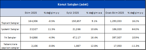 Türkiye’de konut satışları Ekim 2025’te 164.306 adet olarak gerçekleşerek yıllık bazda %0,5 azalırken, aylık bazda %9,1 artış göstermiştir. İpotekli satışlar 23.527 adede yükselerek yıllık bazda %11,5, aylık bazda ise %10,6 artış kaydetmiştir. İlk el konut satışları yıllık bazda %4,9 gerilerken, aylık bazda %16,4 artış göstermiştir. Yabancılara yapılan satışlar Ekim ayında 2.106 adet olarak gerçekleşmiş, yıllık bazda %0,8 azalırken aylık bazda %12,8 artmıştır. Rusya Federasyonu vatandaşları 315 adetlik alımla yabancı alıcılar arasında liderliğini sürdürmüştür.
