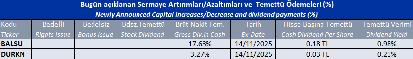 Sermaye Artırımları/Azaltımları ve Temettü Ödemeleri 14/11/2025