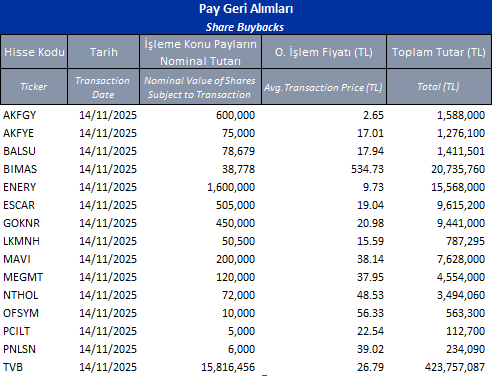 Pay geri alım programları kapsamında ilgili tarihte geri alım yapan şirketlerin listesini aşağıdaki tabloda bulabilirsiniz.