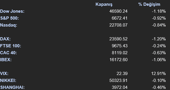 ABD endekslerinde gün genelinde satıcılı bir seyir hakimdi. Dow Jones %1,18 düşüşle 46.590,24 puana, S&P 500 %0,92 gerileyerek 6.672,41 puana, Nasdaq ise %0,84 kayıpla 22.708,07 puana indi. S&P 500 endeksinde işlem gören on bir sektörün dokuzu değer kaybederken değer kazanan sektörler %1,13 ile iletişim servisleri ve %0,84 ile altyapı olurken en çok değer kaybedenler -%1,93 ile finans, %1,88 ile enerji ve %1,53 ile hammadde oldu. Avrupa tarafında da satıcılı görünüm baskındı. DAX %1,20, CAC 40 %0,63, IBEX %1,06 ve FTSE 100 %0,24 değer kaybetti.