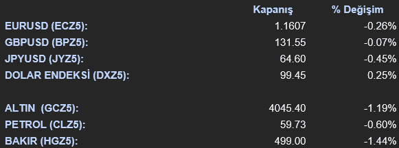 Dolar endeksi (DXZ5) %0,26 değer kazanarak 99,46 seviyesine yükseldi. EUR/USD paritesi (ECZ5) %0,26 değer kaybederek 1,1607 seviyesine gerilerken, GBP/USD paritesi (BPZ5) %0,07 düşüşle 131,55 seviyesinden işlem gördü. JPY/USD paritesi (JYZ5) ise %0,45 oranında geri çekilerek 64,60 seviyesine yöneldi. Değerli metallerde satış ağırlıklı bir görünüm izlendi. Altın (GCZ5) %1,22 düşerek 4.044,40 dolar seviyesine indi. Emtiaların genelinde zayıf görünüm korunurken petrol fiyatları da negatif ayrıştı. WTI petrol (CLZ5) %0,60 değer kaybederek 59,73 dolar seviyesinden işlem gördü. Bakır (HGZ5) ise %1,44 düşüşle 499,00 seviyesinde günü tamamladı. Londra Metal Borsası’nda alüminyum %1,57, bakır %0,68, kurşun %1,28 ve çinko %0,88 değer kaybetti.