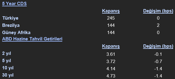 ABD tahvilleri ve gelişmiş ülke tahvilleri haftaya alıcılı başladı. ABD 2 yıllık tahvil getirisi %3,606 seviyesinde sabit kalırken 5 yıllık tahvil getirisi 0,9 puan azalarak %3,722’ye ve 10 yıllık tahvil getirisi 1,5 puan azaldı ve %4,133’e geriledi. Birleşik Krallık 10 yıllık tahvil getirisi 3,9 puan, Fransa 10 yıllık tahvil getirisi 0,6 puan, Almanya 10 yıllık tahvil getirisi 0,8 puan ve İtalya 10 yıllık tahvil getirisi 2,6 puan geriledi. Gelişmekte olan ülke tahvillerinde karışık bir görünüm vardı. Türk tahvilleri ise alıcılı bir seans geride bıraktı. Türkiye 5 yıllık ülke risk primi 0,59 puan düştü ve 244,74’e geriledi.