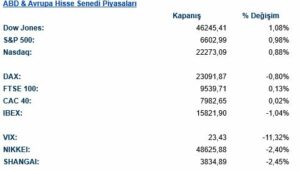 Avrupa hisse senedi piyasalarında ise karışık bir seyir hakimdi. Almanya’da DAX endeksi %0,80 düşüşle 23.091 puana gerilerken, İngiltere FTSE 100 endeksi %0,13 artış kaydetti. Endeks içi sektör dağılımlarına bakıldığında DAX tarafında sanayi hisselerinin %2,88’lik sert düşüşle endeksteki kayıpların ana belirleyicisi olduğu, bilişim teknolojileri ve iletişim hizmetlerinde ise sınırlı toparlanma yaşandığı görüldü. FTSE 100 tarafında tüketici ürünleri, sağlık ve tüketici isteğe bağlı sektörler güçlü performans gösterirken, sanayi ve enerji endeks üzerinde baskı yarattı. Fransa’da CAC 40 yatay bir görünüm sergileyerek 7.982 puandan kapanırken, İspanya IBEX’te %1’in üzerinde düşüş yaşandı.
