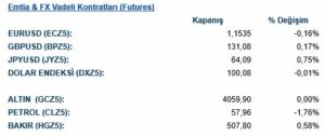 Para birimleri tarafında dolar endeksi (DXZ5) günü yatay kapatarak 100,08 seviyesinde dengelendi. EUR/USD(ECZ5) paritesi %0,16 düşüşle 1,1535 seviyesine gerilerken, sterlin dolar karşısında %0,17 yükseldi ve 131,058 seviyesine çıktı. Japon yeni %0,75 değer kazandı. Değerli metallerde altın 4.059 dolar seviyesinde hareketine devam ediyor. Petrol(CLZ5) ise %1,76 civarında gerileyerek 57,96 dolar civarına indi. Endüstriyel metallerde bakır(HGZ5) %0,58 artışla güçlenmeye devam etti.